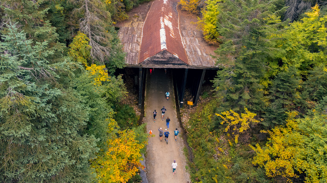 Experience a trail running adventure on the Route of the Hiawatha with a scenic out-and-back course featuring towering forests, rugged peaks, and historic train tunnels.